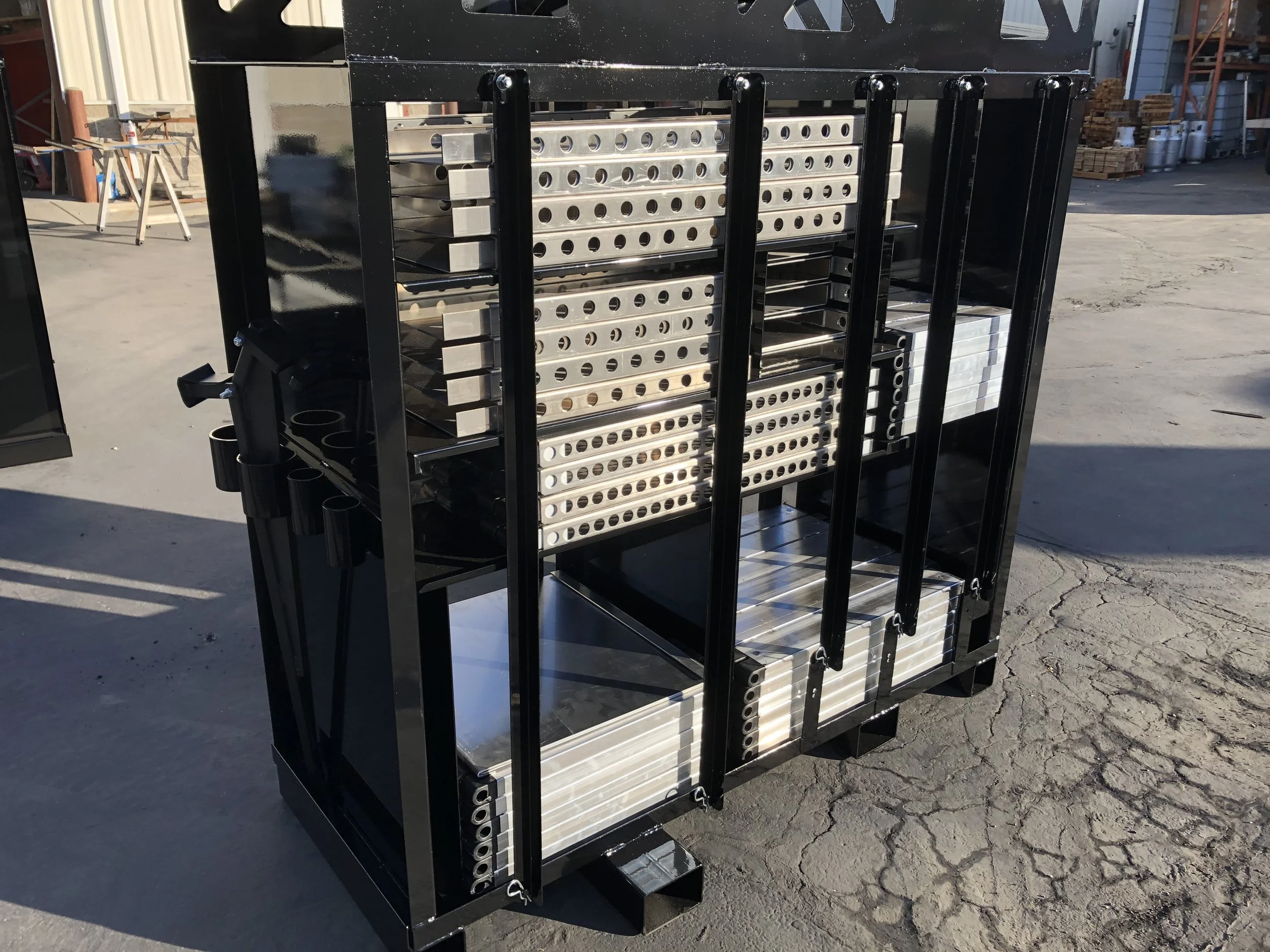 This rack configuration is designed for transport on standard trailers or flatbed trucks, eliminating the need for dedicated towing equipment.